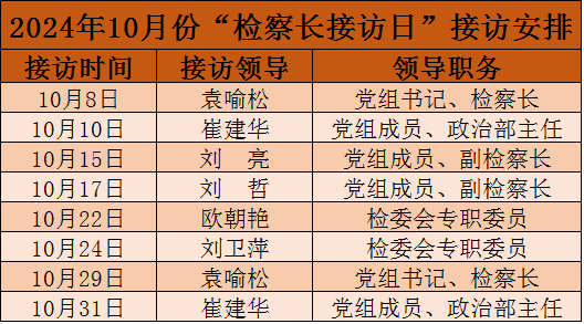 为深入贯彻习近平总书记关于加强和改进人民信访工作的重要思想,践行“以人民为中心”的司法理念,进一步提升12309检察服务中心服务质效,湖口县人民检察院决定每月开展12309检察服务中心“检察长接访日”活动。现将本院10月份“检察长接访日”接访安排公告如下: