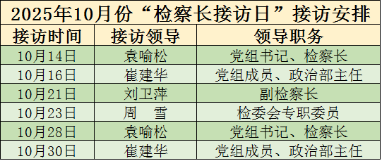 为深入贯彻习近平法治思想,践行新时代“枫桥经验”,提升12309检察服务中心服务质效和群众知晓度,湖口县人民检察院坚持每月开展“检察长接访日”活动,现将本院“检察长接访日”10月份接访安排公告如下: