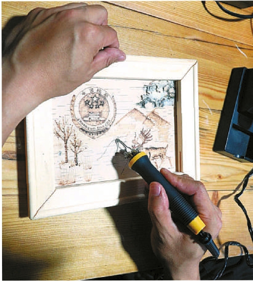 检察干警现场体验将检察元素融入兽皮画制作中。